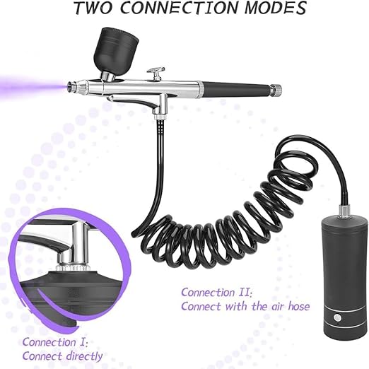 yapı: şık görünüm, makinede delik . Kompakt ve her yere götürülebilir. Düşük basınç seviyesi, airbrush makyajı kullanan kişiler için mükemmel olan 20PSI’dir. Daha yüksek 27 PSI, airbrush boyama alanlarında kullanılmak üzere tasarlanmıştır: model boyama, pasta dekorasyonu, tırnak sanatı, el sanatları, geçici dövmeler vb. Sprey, 40 dakika boyunca tamamen kaldıktan sonra 90 dakika boyunca kullanılabilen bir lityum pil kullanır.