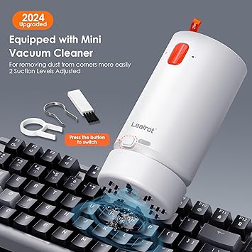 【Yeni Yükseltilmiş Fonksiyon – Şarj Edilebilir Mini Vakum】 Geleneksel temizleme fırçasını değiştirmek için dahili vakum fonksiyonu (2 kademeli emiş ayarlı, 10000 rpm’ye kadar dönme hızı), klavyenin yüzey tozunu kolayca temizleyebilir; uzatma çubuğunu takın, köşedeki tozu daha kolay çıkarın ve çatlayın. Ayrıca, kauçuk kırıntıları, bisküvi kırıntıları, kalem talaşı, kağıt artıkları ve diğer küçük emmek için mükemmel kullanılır. Not: Vakumu kullanmadan önce lütfen tamamen şarj edin