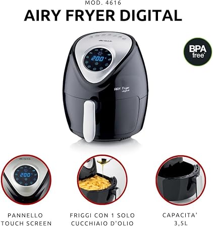Airy Fryer Digital 4616, sıcak hava fritözü 3,5 litre, 60 dakikalık zamanlayıcı, LCD ve dokunmatik ekran, 7 pişirme kademeli, maksimum sıcaklık 200 °C, 1300 W, siyah