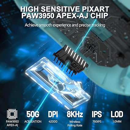 【PixArt PAW3950 Yeni Nesil Amiral Gemisi Sensörü】PixArt’ın en yeni PAW3950 sensörüyle donatılmıştır; hızlı tempolu, rekabetçi oyunlar için birinci sınıf doğruluk ve hassasiyet sağlar; 42.000 programlanabilir DPI, 8000 hz/0,125 ms yoklama hızı, 750 IPS hız ve 50 g hızlanma kapasitesine sahiptir. .Bu en yüksek performanslı optik fare sensörüdür. Motion Sync Teknolojisi nişan almayı ve kontrolü geliştirir.