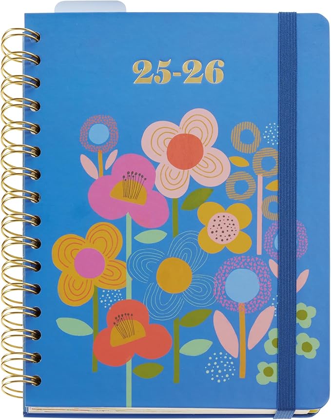 Happy Flowers okul planlayıcısı: Şık mavi arka plan üzerinde renkli çiçeklerle çizilmiş bu ajanda canlı ve rafine bir dokunuş katar. Bakır kabartmalı çift altın metalik spiral ona yüksek kaliteli bir görünüm kazandırır ve 170 x 218 mm boyutu kursu pratik ve yaratıcı bir şekilde düzenlemek için idealdir.
