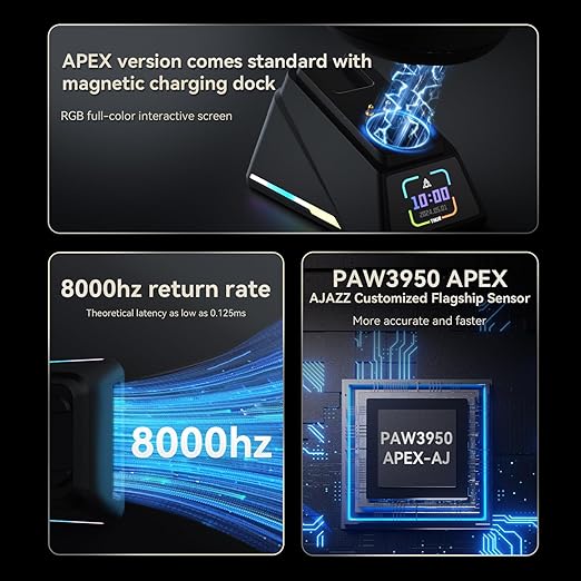 [Özelleştirilebilir Ekranlı Manyetik Şarj Tabanı] AJ179 APEX, RGB renkli ekrana sahip yenilikçi bir manyetik şarj istasyonuyla birlikte gelir. Bu ekran yalnızca tarih ve saati göstermekle kalmaz, aynı zamanda animasyonlu GIF’lerle kişiselleştirilerek oyun sisteminize benzersiz ve canlı bir dokunuş katabilir.
