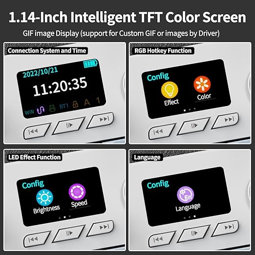 [Canlı Ekran] 1,14 inç TFT renkli ekrana sahip olan AK35I V3, netlik ve dayanıklılık açısından öne çıkar. Bu yüksek çözünürlüklü ekran zamanı, bağlantı modunu, pil ömrünü gösterir ve hatta özel renkli GIF animasyonlarını destekler. Klavyenizin ekranını tarzınıza veya ruh halinize uyacak şekilde kişiselleştirerek onu yalnızca bir araç değil, aynı zamanda kurulumunuzun en önemli parçası haline getirin.
