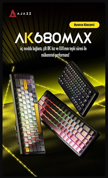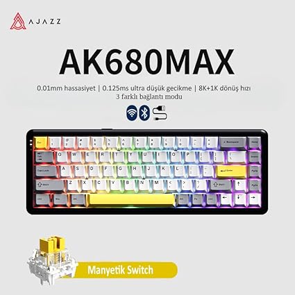 Neden AJAZZ AK680 MAX? İşte Öne Çıkan Avantajlar! Ultra-Hızlı Manyetik Switchler– 0.01mm hassasiyetle anlık tepki süresi 8K Polling Rate– Kablolu modda rakipsiz hız ve gecikmesiz performans 3 Modlu Bağlantı– Bluetooth 5.0, 2.4GHz ve USB-Cile esnek kullanım Dayanıklı & Ergonomik– Alüminyum alaşımlı yapıile uzun ömürlü ve sağlam ⌨️ RGB Aydınlatma– Kişiselleştirilebilir güney yönelimli RGB ışıklandırma ✨ Hot-Swap Desteği– Switchleri kolayca değiştirin, tamamen özelleştirin 3000mAh Batarya– Uzun süreli kullanım, aniden kapanma derdi yok İster rekabetçi bir oyuncu olun ister profesyonel bir kullanıcı, AJAZZ AK680 MAX beklentilerinizi aşacak!