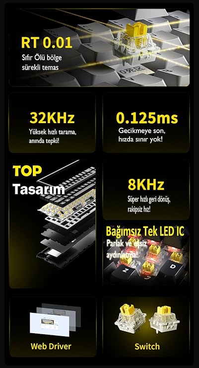 ️ Sağlam TOP-Mount Tasarım & Konforlu Yazma Deneyimi Alüminyum alaşımlı üst plakave TOP-Mounted yapı, daha stabil ve sağlam bir klavye deneyimisunar. Titreşimi minimize eden yapı, yazma ve oyun oynama deneyiminizi çok daha keyifli hale getirir. PORON ses yalıtım köpüğü, tuş seslerini azaltarak daha sessiz ve konforlu bir kullanımsağlar. Hem iş hem oyun için ideal bir mekanik klavye!