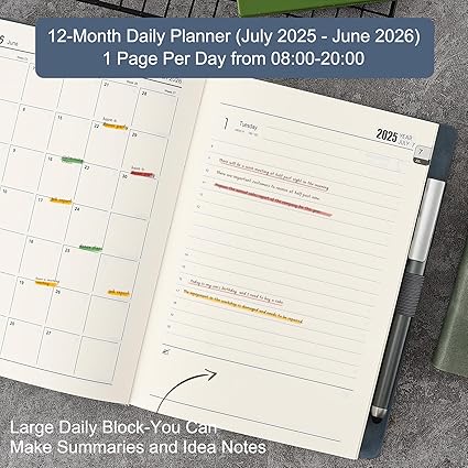 2025-2026 günlüğü – A5 2025-2026 Temmuz 2025’ten Haziran 2026’ya kadar, her sayfada bir gün. (Bir sayfada hafta sonu). 53 haftalık sayfa. 352 sayfa, kişisel bilgi sayfaları, takvimler 2025 ve 2026, yıllık planlayıcı, aylık planlayıcı, adres defteri ve diğer fonksiyon sayfaları dahil. Net ve kolay düzen. İşinizi ve hayatınızı verimli bir şekilde yönetmenize yardımcı olmak için.