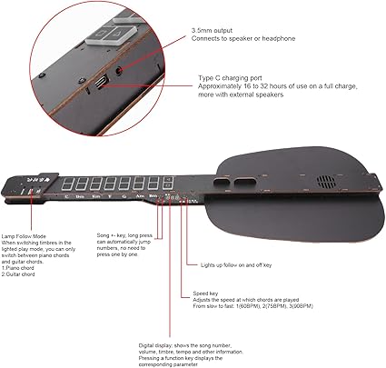 [Uzun kalıcı pil ömrü] Güçlü bir 1800mAh pil ile donatılmış gitarımız tam şarjla yaklaşık 16 ila 32 saat kesintisiz oyun süresi sağlar. Harici hoparlörlere bağlandığında, güç sınırlamaları konusunda endişelenmeden daha uzun kullanımın tadını çıkarabilirsiniz.