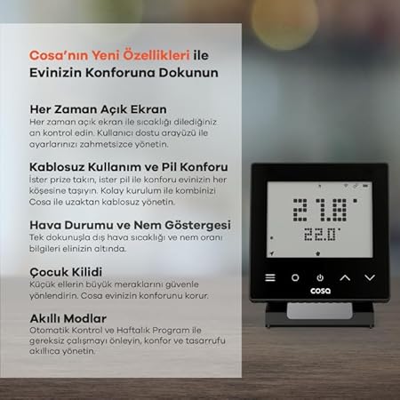 Kablosuz kombi kontrolü Kullanıcı dostu dokunmatik arayüz Her zaman açık ekran özelliği Çocuk kilidi ile güvenli kullanım Pil veya adaptörle çalışma seçeneği Enerji tasarrufu modları ile düşük faturalar Kolay kurulum için tüm aksesuarlar kutu içinde