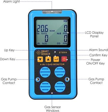 çeşit gazı tespit eder: karbon monoksit (CO), hidrojen sülfür (H₂S), oksijen (O₂) ve yanıcı gaz (LEL).