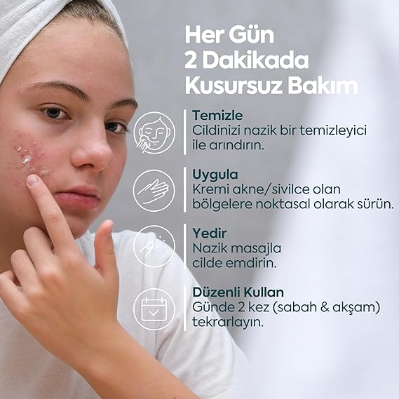 Benzoil Peroksit İçermez – Nazik ve Güçlü Alternatif: Benzoil peroksit içermeyen bu krem, daha nazik bir akne tedavisi arayanlar için harika bir seçenektir. Akne yüz yıkama jelleri veya vücut yıkama ürünleriyle birlikte kullanıldığında etkisini artırır.