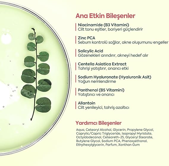 ✨ Leke Giderici ve Cilt Tonunu Eşitleyici Etki: Niasinamid ve Centella Asiatica özü sayesinde, geçmiş sivilcelerden kalan koyu lekeleri zamanla azaltır. Cilt tonu daha aydınlık ve eşit görünüme kavuşur; bu da onu etkili bir akne lekesi kremi ve leke giderici yapar.