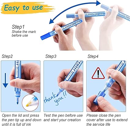 【Kolay kullanım】Her kullanımdan önce akrilik markerleri yaklaşık 10 kez yukarı ve aşağı sallayın. Kapağı açın ve ucunu mürekkeple dolduruncaya kadar yukarı ve aşağı itin. Sonra yazdırmaya başlayabilirsiniz. Ayrıca mürekkebin kurumasını önlemek için kullanımdan sonra kapağı sıkıca kapatmayı unutmayın.