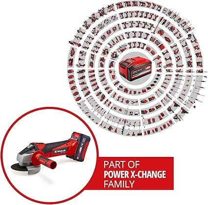 Power X-Change – TC-AG 18/115 Li (1×4.0 Ah) akülü avuç taşlama, aküler, şarj cihazları ve sistem cihazlarının esnek bir şekilde birleştirilebildiği Einhell Power X-Change ailesinin bir parçasıdır.