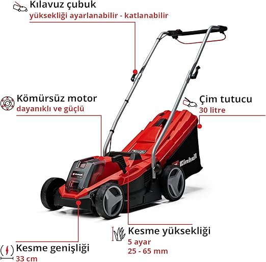 Einhell Akülü Çim Biçme Makinesi GE-CM 18/33 Li-Solo, Power X-Change ailesinin güçlü ve esnek bir üyesidir. 200 m²’ye kadar olan alanlarda önerilir.