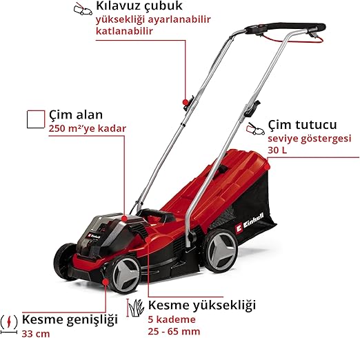 Çim toplama kutusundan dolum seviyesi göstergesi, geniş tekerlekler ile ezilmeyi önleyen çim dostu kullanım