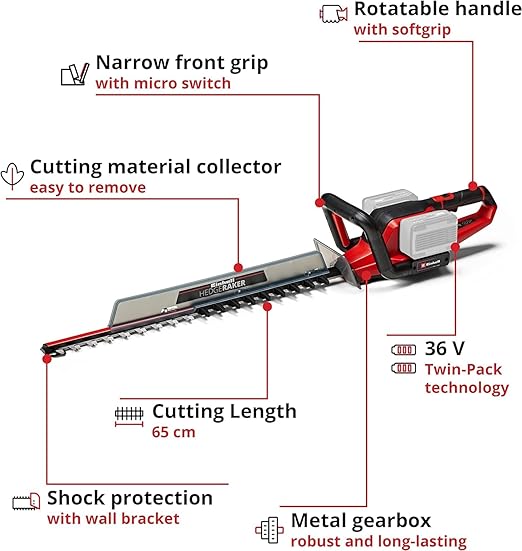 Einhell GE-CH 36/65 Li-Solo, Power X-Change akü ve şarj cihazı olmadan teslim edilir. Bunlar ayrı olarak, örneğin pratik bir başlangıç seti olarak temin edilebilir. Akülü çit budama 2 adet 18V akü ile çalışır.