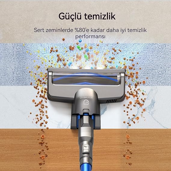 Hızlı Temizlik: Standart modda, bu hafif kablosuz süpürge 12kpa emiş gücü sağlar, günlük temizlik ihtiyaçlarınızı zahmetsizce karşılamak için döküntüleri, evcil hayvan tüylerini, kedi kumunu, köpek mamasını ve zemin kirini anında emer. Bu sayede temizliğe daha az, sevdiğiniz şeyleri yapmaya daha çok zaman ayırabilirsiniz
