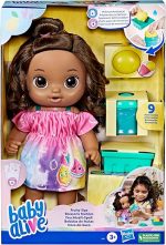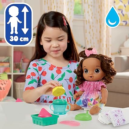 3 yaş ve üzeri çocuklara yönelik bu oyuncak bebek seti, meyve tasarımlarına sahip gökkuşağı renginde çıkarılabilir bir Baby Alive kıyafeti içerir