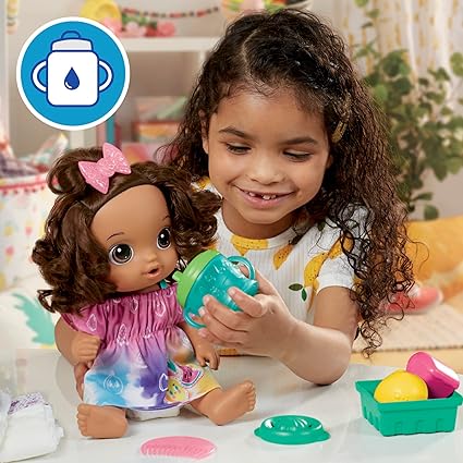 Bu Baby Alive Meyveli Yudumlama bebeği ile çocuklar, Baby Alive oyuncak bebeğini beslemek için hayali meyve sıkacağı ve damlatmaz bardak aksesuarını kullanabilir