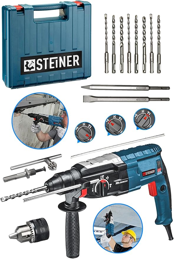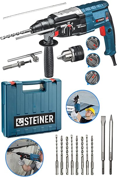 Alman Steiner Heavy Duty Profesyonel Kırıcı Delici Hilti Teknik özellikler: Güç: 4000 watt Darbe gücü: 5.0 joule Devir sayısı: 0 – 1400 dev / dk Darbe sayısı: 0 – 4800 darbe / dk Uç yuvası: Sds + Maksimum delme kapasitesi (beton) : 24 mm