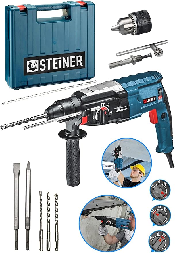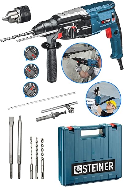 Alman Steiner Heavy Duty Profesyonel Kırıcı Delici Hilti Teknik özellikler: Güç: 4000 watt Darbe gücü: 5.0 joule Devir sayısı: 0 – 1400 dev / dk Darbe sayısı: 0 – 4800 darbe / dk Uç yuvası: Sds + Maksimum delme kapasitesi (beton) : 24 mm