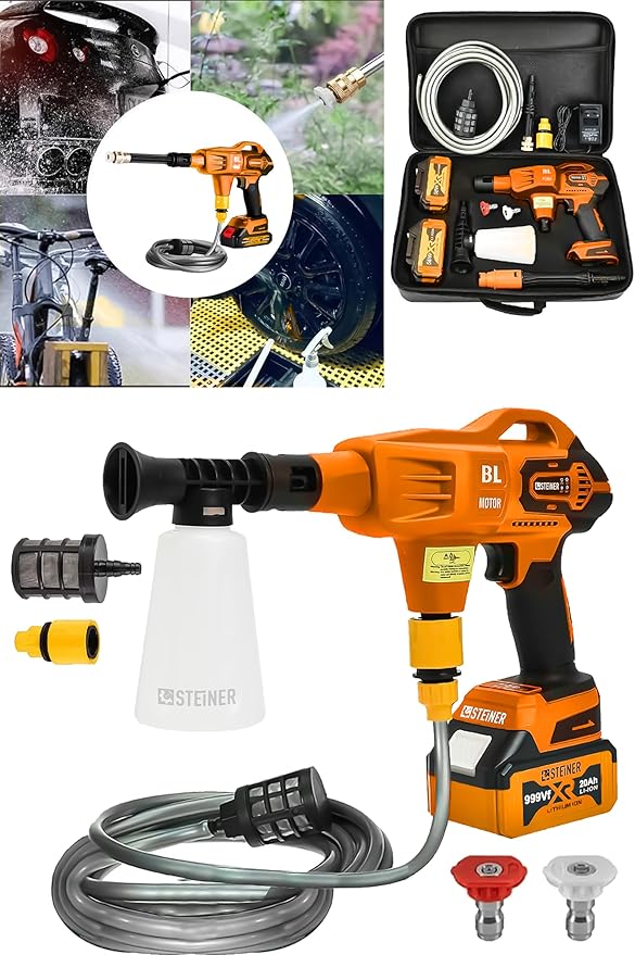 STEINER Alman 999 Vf 20 Ah 100 Bar Kömürsüz Şarjlı Oto Yıkama Makinesi Çift Akülü Bahçe Yıkama Makinası Turuncu