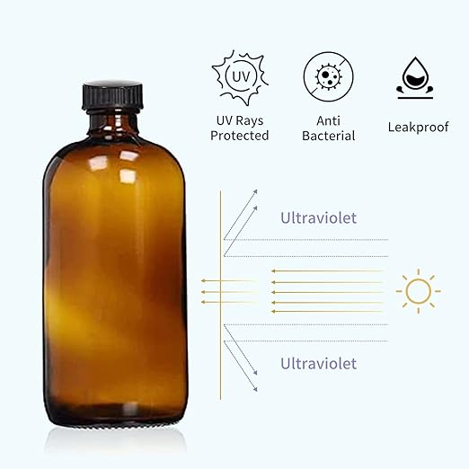 ➤ UV Koruması – Koyu kahverengi gölge, şişeyi ultraviyole ışınlarından ve sıvı içeriğinden korur. Ayrıca, Amber cam şişeler, uçucu yağları güvende tutmak için harika ve verimli güçlü yağlardan etkilenmez.