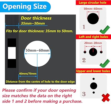 Kolay montaj: Ayarlanabilir sürgü (delik ortasından kapı kenarına olan mesafe) – 60 mm veya 70 mm, kapı kalınlığı için uygundur: 35 mm ila 50 mm