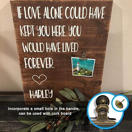 Bronz bağlayıcı klipsler, klipsleri duvarlara, kapılara, afiş duvarlarına ve daha fazlasına asmak için kulplarda küçük bir delik içerir