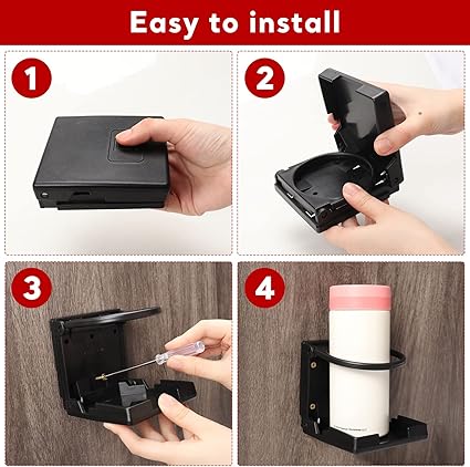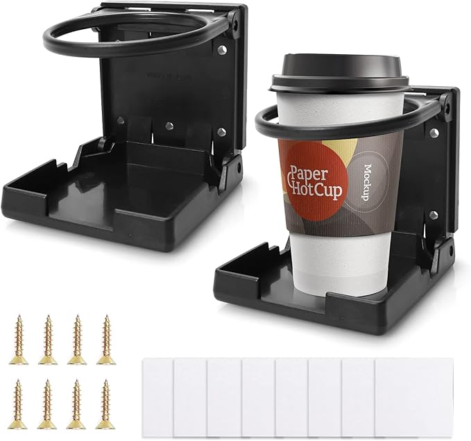[İki farklı kurulum yöntemi] — Paket 2 katlama çubuğu, 8 vida ve 8 çift taraflı yapışkan bant içerir. Bardak tutucu kolay kurulur, vidayı doğru pozisyonda vidalayın. Ayrıca her düz dikey yüzeye çift taraflı yapışkan bant ile yapıştırılabilir. Sadece montaj yüzeyini temizleyin ve bardak tutucunun arka tarafına çift taraflı yapışkan bandı yapıştırın.
