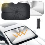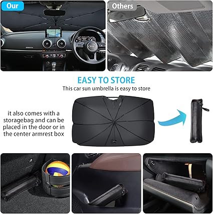 Kurulumu ve saklaması kolay: Güneş şemsiyesini bir şemsiye gibi kolayca gerebilirsiniz ve arabanızın ön camına kolayca sabitlenebilir. Araç güneşliğimiz tek dokunuşla kilide ve su geçirmez bir saklama çantasına sahiptir, böylece kolayca katlanabilir ve torpido gözünde veya kapı kaplamasında saklanabilir, bu da yerden tasarruf sağlar ve kullanımı kolaylaştırır.