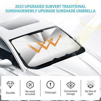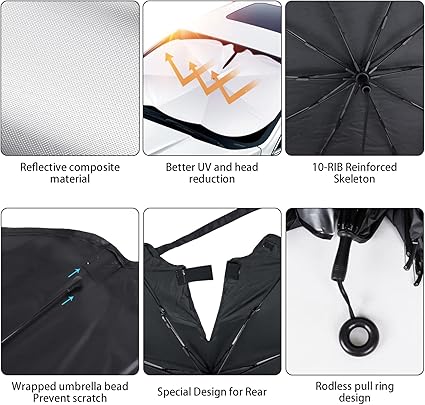 Yüksek kaliteli malzemeler: Ön cam güneşliğimiz, güneş ısısına karşı mükemmel koruma sağlamak için UPF 50 lamine polyester ile kaplanmış titanyum gümüş jel ile kaplanmıştır. Şemsiye çerçevemiz, mükemmel dayanıklılık sağlamak için on sağlam, çelik takviyeli çubuktan yapılmıştır!