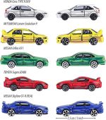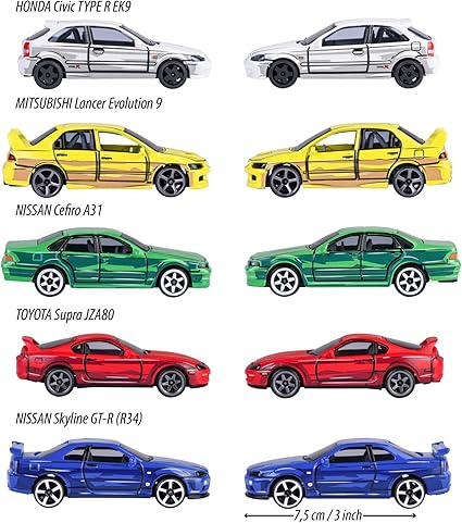 5’li set araba – Hediye seti içeriği: 1. Honda Civic Tip R EK9 (beyaz), 2. Nissan Cefiro A31 (yeşil), 3. Nissan Skyline GT-R (R34) (mavi), 4. Toyota Supra JZA80 (kırmızı), 5. Mitsubishi Lancer Evolution 9 (sarı)