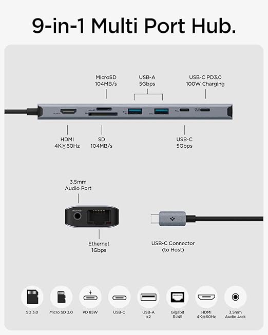 ArcDock 85W Güç Adaptörü 9in1 USB-C Multi Hub / Çoklayıcı 9 Port / 4k 60hz / Ethernet 1Gbps / MacBook PD2306 Space Gray – ACA06388