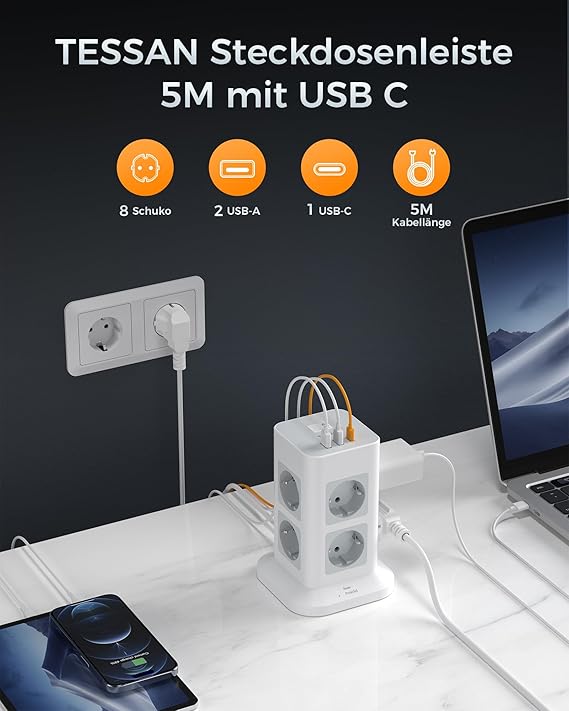 3 USB’li güç şeridi: USB’li TESSAN çoklu soketleri toplam 3A akımını destekler. Çoklu priz kulesi fişli ayırıcı soket, cihazlarınızı algılayabilir ve cep telefonları, tabletler ve diğer USB cihazları için uygun olan 2,4 A’ya kadar şarj akımı sağlayabilir.
