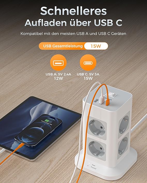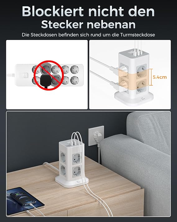 USB’li 8 uzatma kablosu priz: 8 soketli soket kulesi dikey olarak 4 yüzeydedir ve normal çoklu fişlerden daha fazla yer tasarrufu sağlar. 3 USB’li çoklu soket, ev ofisinizin şarj ihtiyaçlarını karşılar.