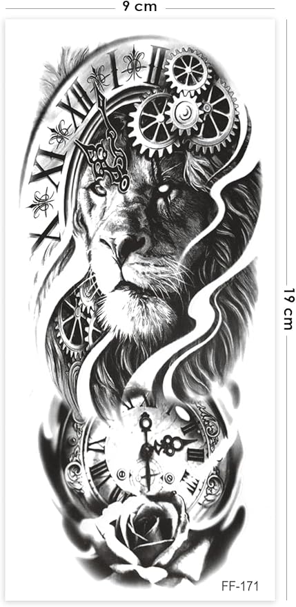Aslan Dövmesi, Saat Figürlü Geçici Dövme, Tattoo, Erkek Geçici Dövme, Kol Dövmesi, Vücut Dövmesi, Su Transferli Modern Dövmeler