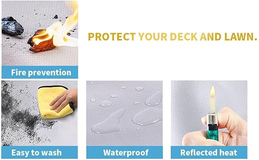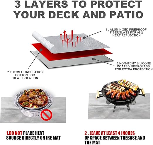 Not: Izgaranıza uyduğundan emin olmak için lütfen sipariş vermeden önce genişliği ve derinliği ölçün. Daha iyi ısı direnci için alüminize yansıtıcı tabakayı yukarı bakacak şekilde yerleştirin. Isı kaynağını doğrudan yangın matının üzerine yerleştirmekten kaçının ve matı çevreleyen alanı daha iyi korumak için en az 4 inç/10,16 cm boşluk bırakın.