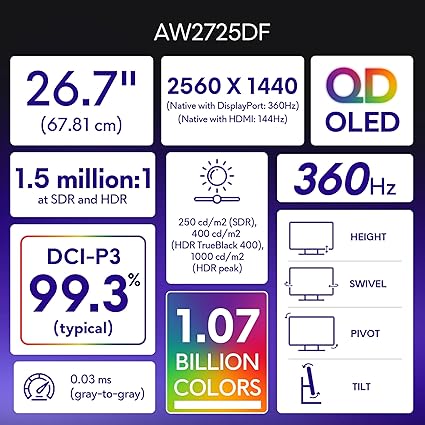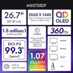 AW2725DF 27 inç QHD (2560 x 1440) oyun PC ekranı, 360 Hz, QD OLED, 0,03 ms, AMD FreeSync Premium Pro,%99,3 DCI-P3, HDR400, USB-C, 2X DisplayPort, HDMI, 4X USB, 3 yıl garanti