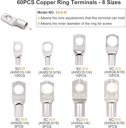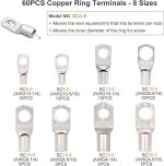 60 bakır halka kablo pabucu seti, kutulu 8 boyut, çoğu uygulama için uygundur