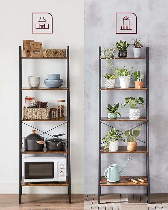 Ayaklı Raf, Kitaplık, 5 Raflı, Metal İskeletli, Pratik Montaj, Oturma Odası, Yatak Odası, mutfak için, 56 x 34 x 172 cm (U x G x Y), Vintage Kahverengi-Siyah LLS45X