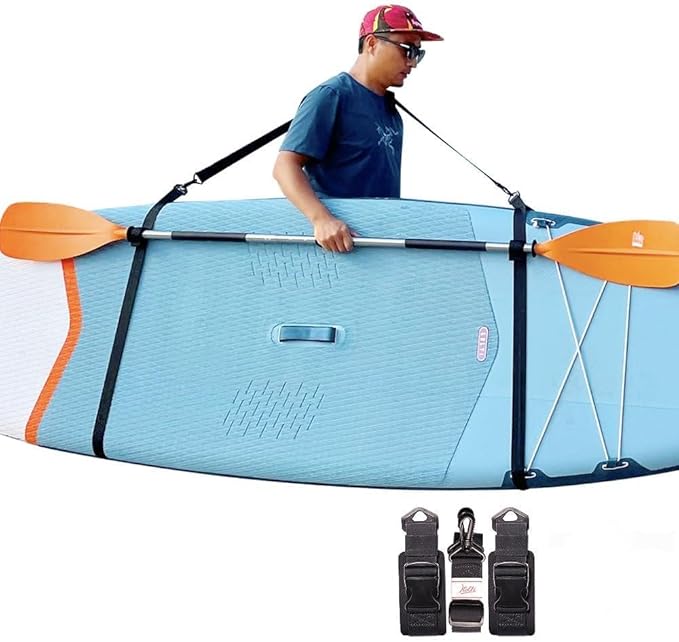 Eller serbest taşıyıcı. Güçlü kendinden yapışkanlı halka kayış kürek sörfü tahtasınızı ve küreğinizi bir arada tutabilir, ardından omuz askısını sabitleyin ve eller serbest taşıma için omuzlarınıza yerleştirin.