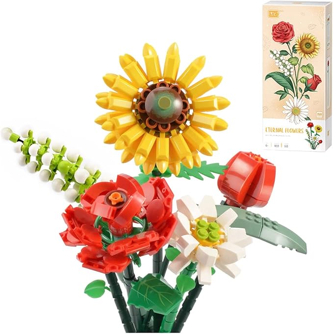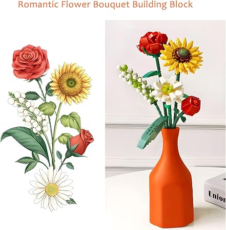 Etkileyici Yapı Buketi】Bu çiçek buketi blokları gerçek Ayçiçeği, Gül, Küçük Papatya’dan ilham alan renkli bir görüntü ve eğlenceli şekiller sunar
