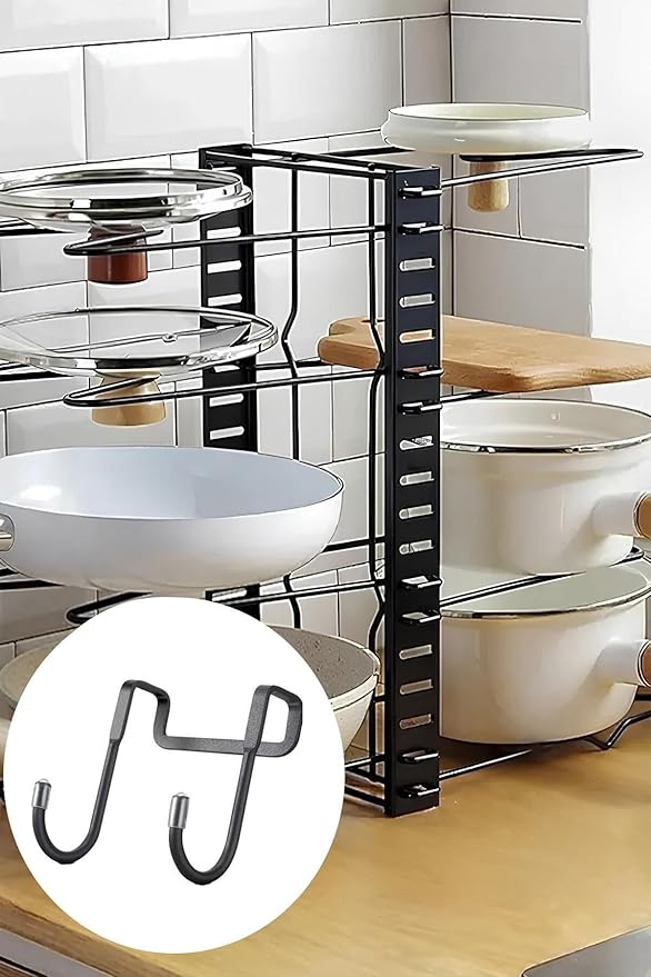 Ayrılabilir Mutfak Depolama Fonksiyonlu Tencere Tava Düzenleyici ve 2 Kancalı Askı Seti Siyah Tek Ebat