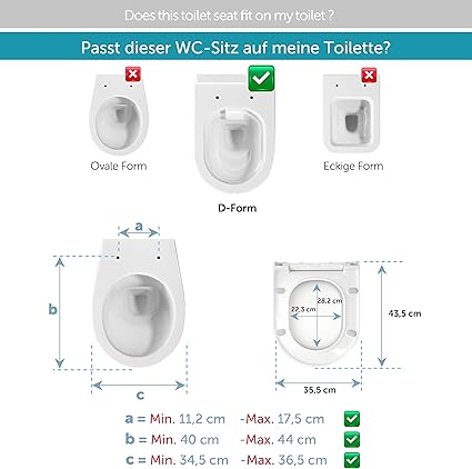 ✅ Hızlı montaj: İnce model acemiler olarak da hızlı ve kolay monte edilir. D şekli ile tüm standart klozetlere uyar. Lütfen tuvalet gözlüğünün ölçülerinin tuvaletinize uygun olup olmadığını kontrol edin.