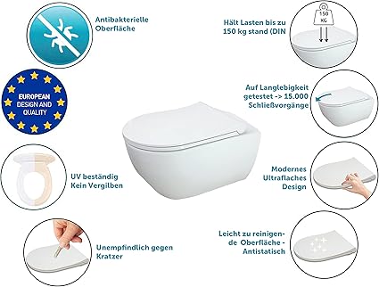 ✅ Antibakteriyel: Tuvalet kapağının birinci sınıf kalitesi kullanılan malzemeyi de yansıtır. Kullanılan Duroplast malzeme sayesinde tuvaletinizde mikrop ve bakterilerin yayılması önlenir. Yüksek UV dayanıklılığı sararmaya karşı korur. Yüzeyler antistatiktir ve çiziklere karşı dayanıklıdır.