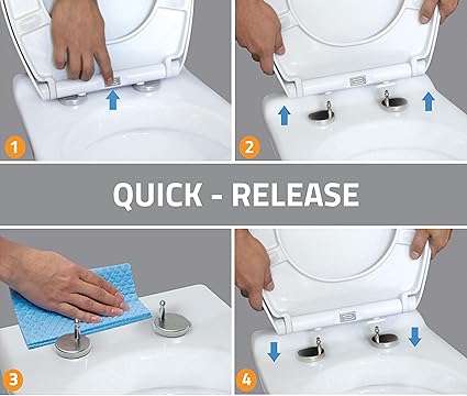 ✅ Otomatik indirme ve çıkarılabilir: Hidrolik yavaş kapanma otomatiği sayesinde tuvalet kapağı ve tuvalet gözlüğü sadece dokunarak yumuşak ve sessiz bir şekilde katlanabilir. Kapak, düğmeye basarak (Quick-Release süre) çıkarılabilir, bu da kolay ve hızlı bir temizlik sağlar.