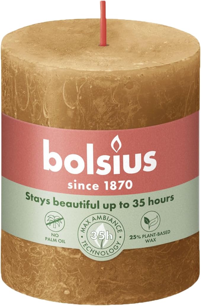 Bolsius’un rustik sütun mumları, farklı renk tonlarında, 8 cm yüksekliğinde ve 35 saat boyunca yanma süresine sahiptir.