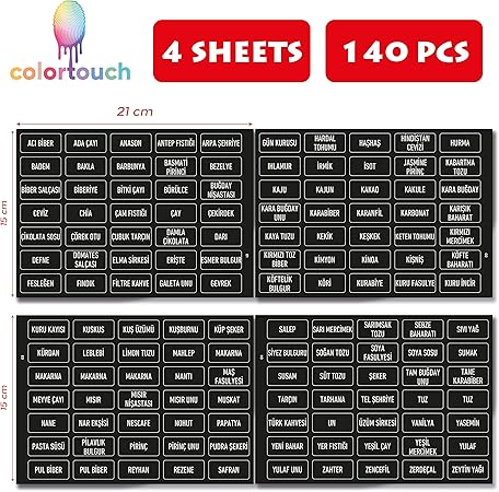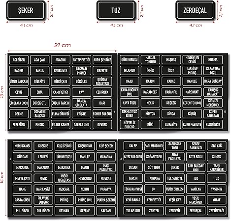 Kullanım alanı ve kullanım talimatı: Kavanozlar, baharat kutuları, raflar, baharat kavanozları, saklama kapları ve her türlü çekmece için uygundur. Tüm etiketler silinebilir ve su geçirmez. (Elde yıkamanızı ve g kimlar kullanmamanızı öneririz.) Bu harika çıkartmalarla kendi mutfağınızı tasarlamayı seveceksiniz.