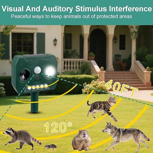 2025 yeni sürüm yükseltmesi: Bu kedi kovucu ultrason, 120 derecelik bir yay içinde ve 12 m mesafeye kadar hareketleri algılayan gelişmiş bir PIR hareket sensörüne sahiptir. Ultrasonik dalgaları 50 kHz frekanslı gönderir ve kedileri, köpekleri, tilkileri, rakunları, kokarcaları, geyikleri, tavşanları ve sincapları etkili bir şekilde korkutmak için hem ultrason sesleri hem de stroboskop ışıkları tetikler.